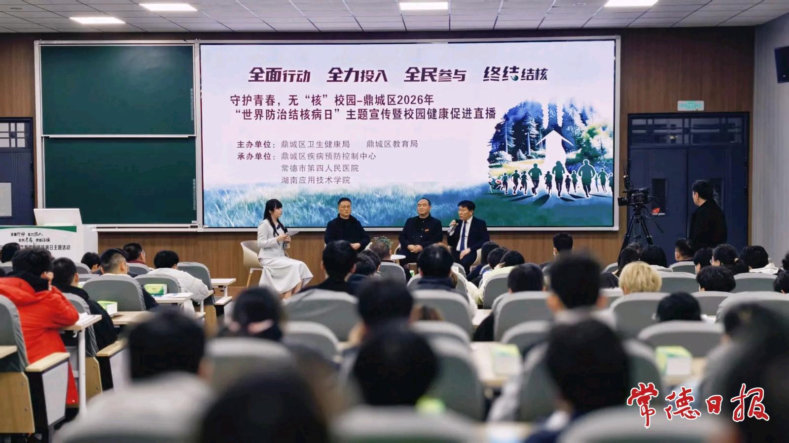 常德日报记者 徐珊珊 通讯员 潘亚娇 杨水才 文/图 日前,常德市第四人民医院联合鼎城区疾病预防控制中心、湖南应用技术学院,在湖南应用技术学院多媒体教学楼举办了一场结核病科普直播活动,线上线下同步普及防治知识,吸引7.9万人次观看。