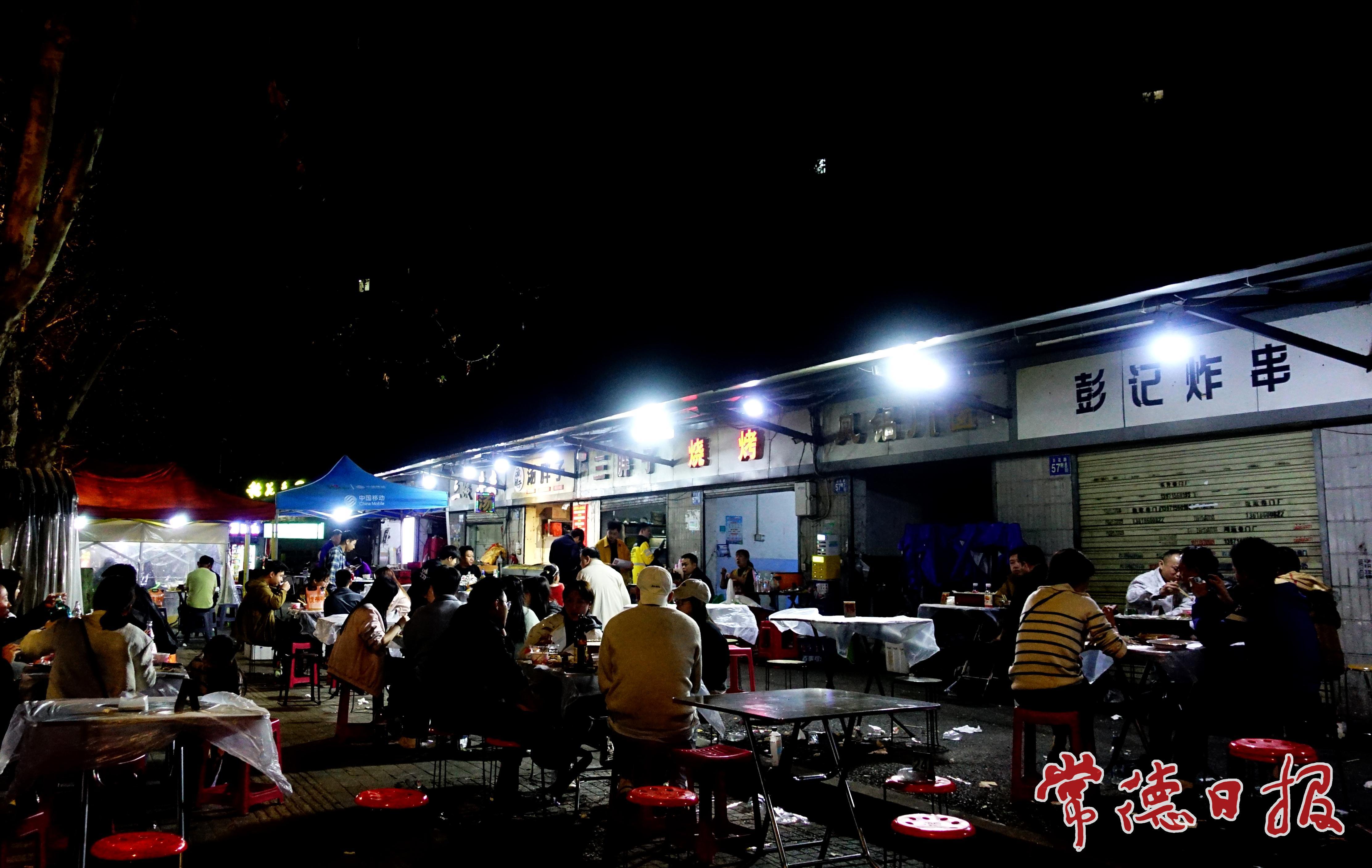 当夜幕降临,武汉才真正醒来。夜生活的核心是“吃”——确切地说是“宵夜”。吉庆街是汉派宵夜的代表,卤鸭脖、凉拌毛豆摆满整条街。吃是配角,吹拉弹唱的民间艺人穿梭席间才是灵魂,一部同步直播的手机成了演出最好的搭档。听“夜猫子”讲,“你来的不是时候,真正热闹的是另一处胜地万松园,那是小龙虾爱好者的天堂。夏夜里蒸虾、油焖、蒜蓉各来一份,配上一碗凉面,那才是武汉人的夏天。”