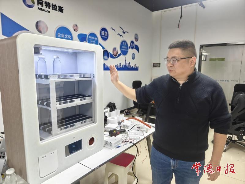 张亮是桃源人,曾在深圳积累了丰富的行业经验,却在长沙的首次创业中遭遇挫折。2025年10月,带着智能鲜奶柜项目,他回到家乡常德,与常德市科技企业孵化器正式接洽。仅13天,孵化器就完成了场地对接、手续办理等全部流程,为阿特拉斯提供了280平方米的办公、研发一体化空间,彻底解决了企业研发调试设备时的空间受限难题。