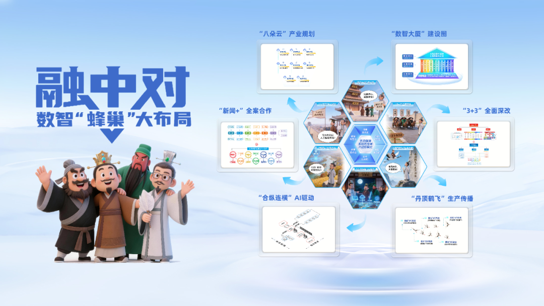 数智演播厅展屏上,分别展示AI+时政、AI+创作、AI+场景等系列产品,战略共创、技术合作、校地联动、跨省合作、舆情监测等项目实践,让各位领导留下深刻印象。