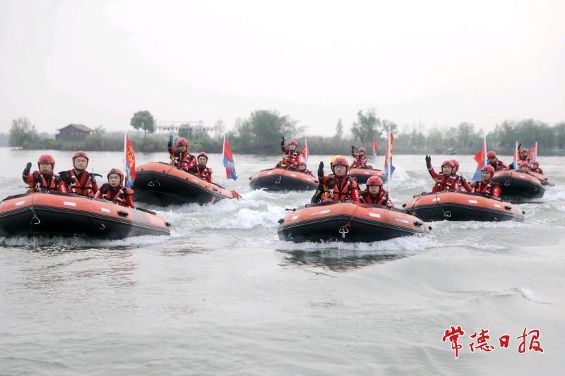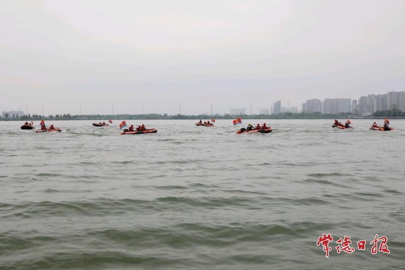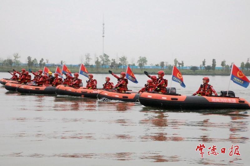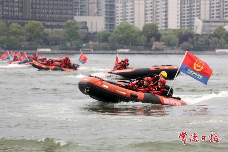 柳叶湖上,马达声响。一艘艘橘红色冲锋舟劈开水面,在湖心划出交错的白浪。