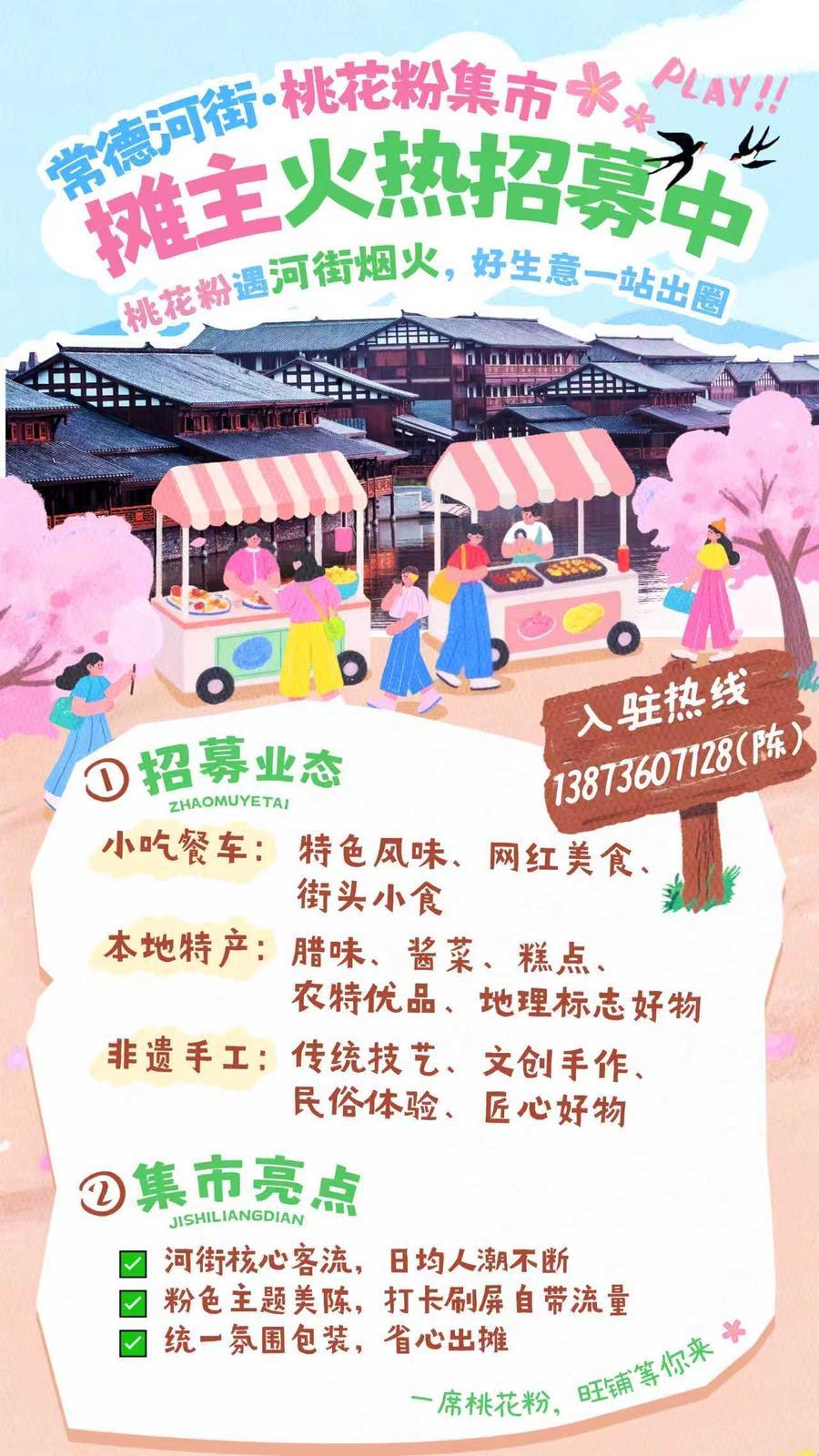 由常德经投集团主办、常德市融媒体中心(筹)承办的常德河街桃花粉集市,正式面向全城启动招商。集市位于常德河街核心区域春秋广场,面向特色餐饮、非遗手工、本土特产、文创潮品等全业态开放入驻,诚邀广大商户、手艺人、创业者一同扎根城市地标,共享海量客流与发展商机。