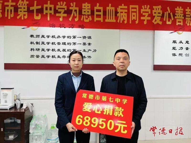 常德日报记者 黄云霞 通讯员 刘靖诗 文/图 “谢谢老师和同学们的慷慨解囊,给了我女儿战胜病魔的勇气。”4月15日上午,常德市七中高2510班沈同学的妈妈周女士从校领导手中接过68950元爱心款时感激道。她说,这笔爱心款就像“及时雨”,为全家带来了希望和力量。