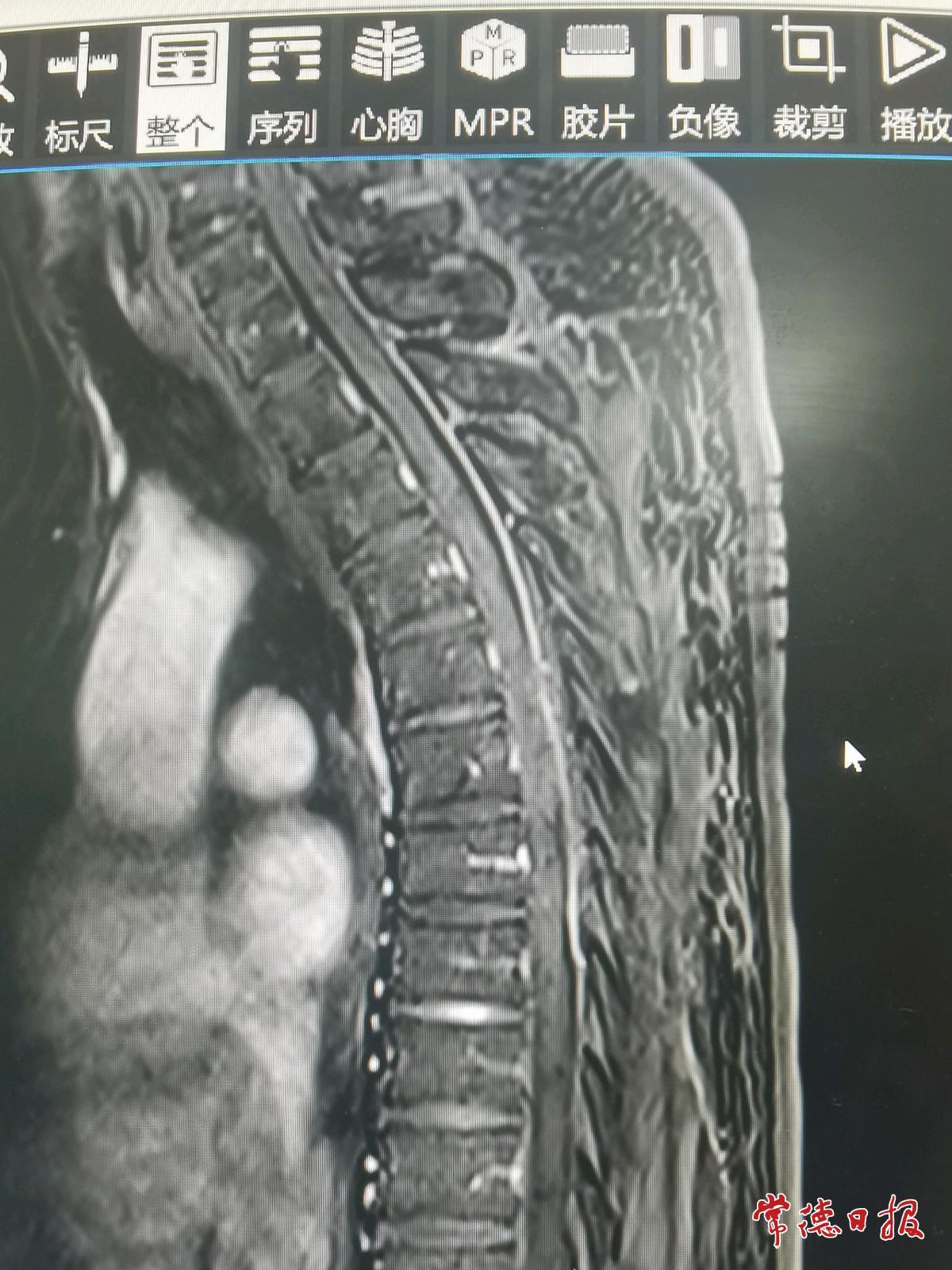 经磁共振检查,医生发现邓伯伯胸6-7椎管内长有一个血管瘤,属于脊髓肿瘤。正是肿瘤压迫神经,导致双腿功能逐步“失灵”。