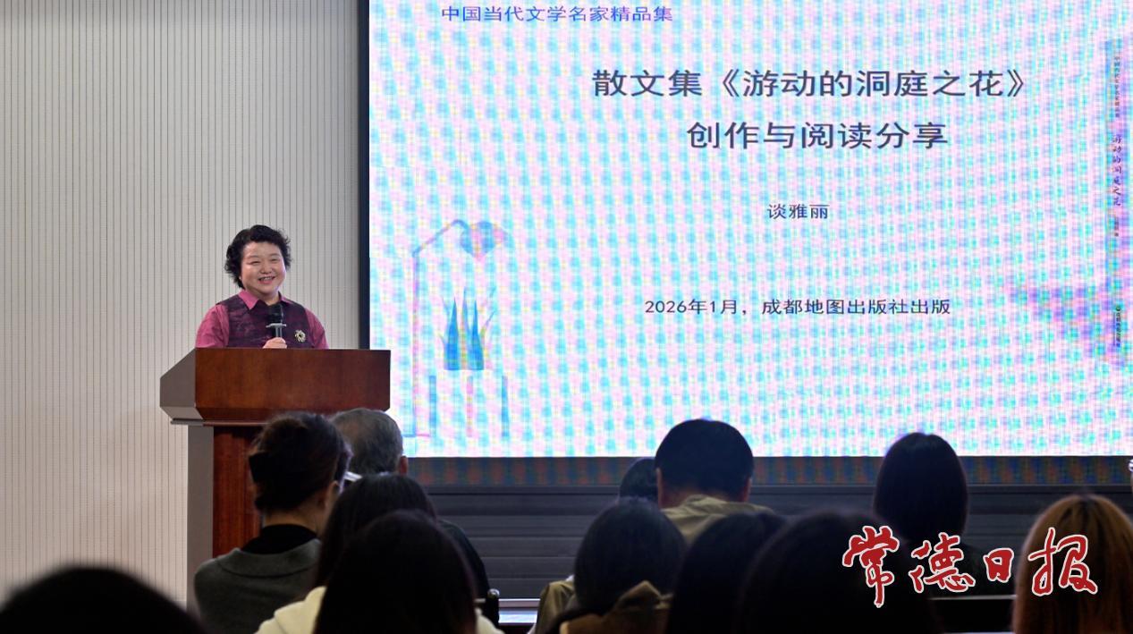 读书分享会上,常德市作家协会主席谈雅丽则围绕新作《游动的洞庭之花》,分享创作历程。她讲述了自己在洞庭湖进行田野调查的经历,被珍贵物种和爱鸟人的坚守深深打动,因而写下了这部作品。现场有读者深受共鸣,主动朗读书中片段,赢得阵阵掌声。针对新书创作感受的提问,谈雅丽坦言,是洞庭湖的景物与生灵给予了她写作的力量。现场还进行了谈雅丽新书签名活动。