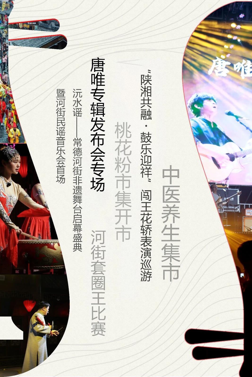 内容:沅水谣非遗舞台启幕盛典、民谣音乐会、唐唯专辑发布会专场;“致敬经典”河街音乐会、“舞动青春”国潮电音派对(“五四”青年节专场);闯王花轿表演巡游;中医养生集市、套圈王比赛、桃花粉市集。