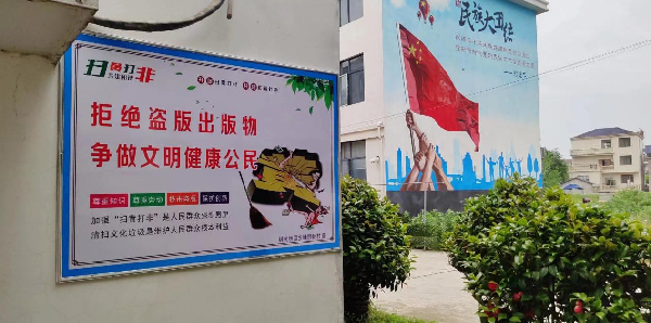 7月1日,常德市桃源县洋溢着一片红色浪漫,4A级景区枫林花海内,俏丽的月季花进入最佳观赏期,引来游人如织;景区外,多处“拒绝盗版出版物 争做文明健康公民”等“扫黄打非”宣传牌,在人群聚集处贴挂,花木映衬下,更显鲜艳醒目。