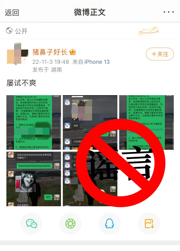 星辰在线11月3日讯(星辰全媒体记者 彭穗) 近日,网上出现多个版本的“疫情补贴”信息引发关注,其中,一条“疫情期间长沙市民将享受补贴50元/天”的信息在网上传播。经相关部门核实,网上传播的信息为谣言。
