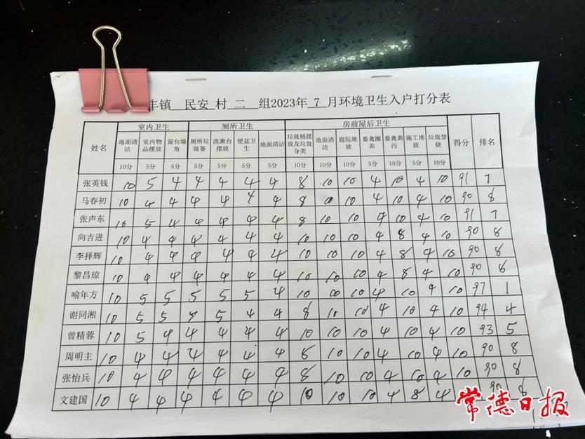 “大到房前屋后的卫生,小到厕所的洗漱台摆放,都是我们每个月入户打分的重点。”7月18日,在西洞庭管理区祝丰镇民安村村部,村党总支书记叶真翻着该村《7月环境卫生入户打分表》向记者介绍。