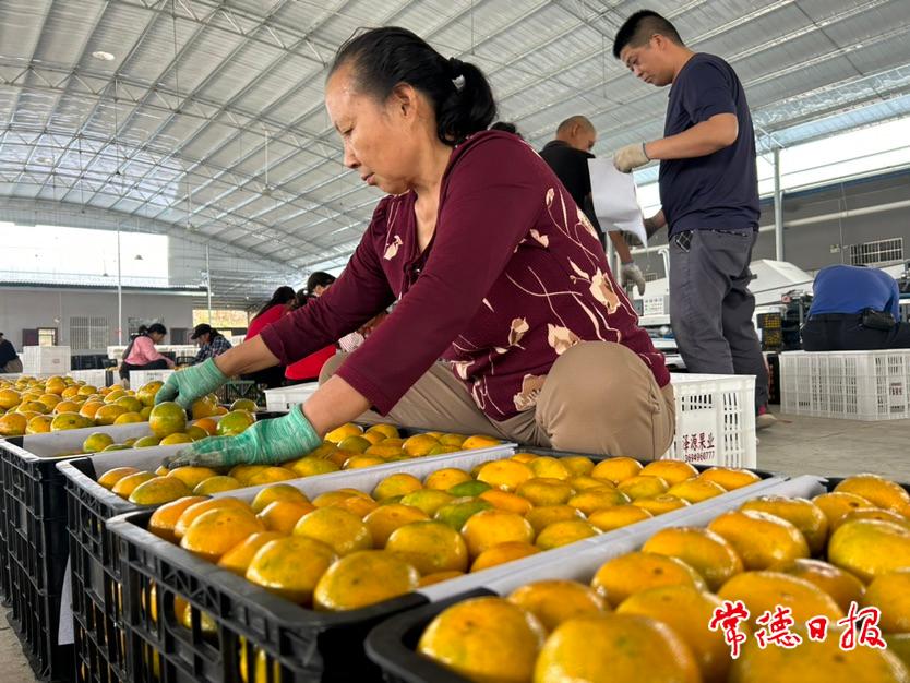 澧县泽源水果专业合作社的柑橘加工车间,橘农们把柑橘送到自动分级机上,对产品进行分级,优质果经过果皮清洁、风干、打蜡包装等加工之后,将送到湖北、河南等地的大型商超。