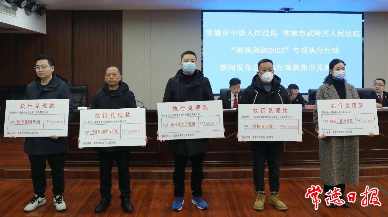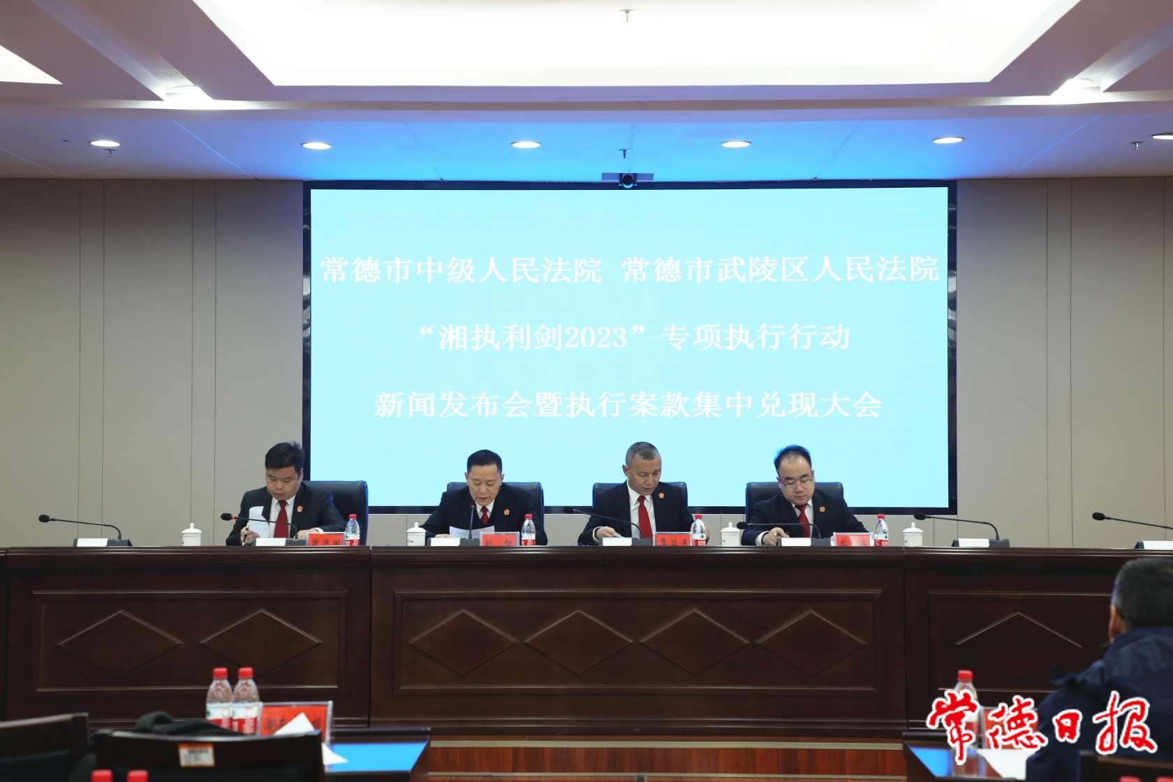 常德日报记者 李张念 通讯员 范亚娉 文/图 12月28日,常德市中级人民法院、武陵区人民法院联合举办“湘执利剑2023”专项执行行动新闻发布会。会议通报了全市法院执行工作情况,并现场发放执行案款7554万余元。