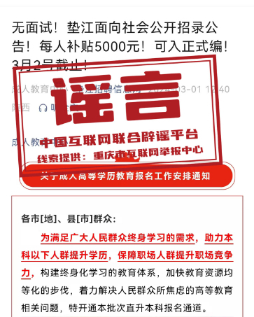 真相:近日,“垫江招聘信息网”微信公众号发布信息:“无面试!重庆垫江面向社会公开招录公告!每人补贴5000元!可入正式编!”部分网民看到该信息后误认为,垫江面向社会以补贴形式招录具有正式编制的公务人员,于是纷纷向垫江县有关部门致电咨询招录情况。经核实,近年来,垫江未曾以补贴方式和不经过面试招录具有正式编制公务人员。该信息实则为成人学历提升培训信息,而非正式编制公务人员招录信息。垫江县互联网信息办公室已依法对发布该信息的微信公众号负责人进行约谈和教育批评,指出虚假信息的危害性,并责令删除相关信息。(来源:重庆辟谣)